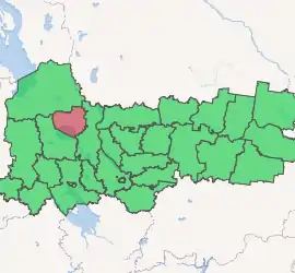 Vashkinsky District (Russian: Ва́шкинский район) is an administrative[1] and municipal[7] district (raion), one of the twenty-six in Vologda Oblast, Russia. It is located in the northwest of the oblast and borders with Vytegorsky District in the north, Kirillovsky District in the east, and with Belozersky District in the south and west. The area of the district is 2,900 square kilometers (1,100 sq mi).[4] Its administrative center is the rural locality (a selo) of Lipin Bor.[3] District's population: 8,089 (2010 Census);[5] 10,002 (2002 Census);[9] 11,977 (1989 Census).[10] The population of Lipin Bor accounts for 45.4% of the district's total population.[9]