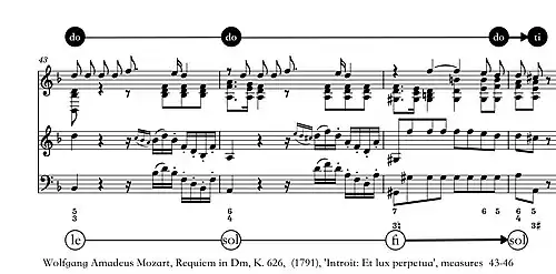 The le-sol-fi-sol is a 4-stage pattern, based on a b6-5-#4–5 bass line. Its most common harmonization is VI–i6/4–#ivo7–V(7), frequently with a cadential 6/4 over the dominant. The function of the pattern's first three stages is equivalent to that of an augmented sixth chord.[7]