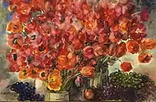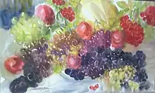 In landscape painting the artist was giving pride of place to generous gifts of the South of Ukraine – juicy, mature vegetables and fruits, vivid flowers. Watercolors of flowers united in series brought him great success. As a "King of flowers and emperor of sunflowers" a fine art expert from Alexandria M. Sheryf named Vasyl. Vasyl Andriiovych worked often and incessantly on floral compositions by moving up images to the frames of pictures, by approaching images as much as possible to spectators. He pictured flowers in contourless sketchy manner that makes possible to reproduce flowering, rustle, smell.[3]