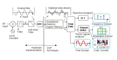 Vector signal analyzers are useful in measuring and demodulating digitally modulated signals like W-CDMA, LTE, and WLAN.[1] These measurements are used to determine the quality of modulation and can be used for design validation and compliance testing of electronic devices.