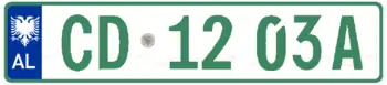 Diplomatic corps vehicle registration plates in Albania have green borders and green texts on a white background. They do not have the blue strip on the right hand-side of the plate, unlike private vehicle registration plates. They follow the format [CD 00 00A], where CD stands for corps Diplomatique. The first 2 digits of the license plate refer to the Diplomatic license plate codes (explained later in the article). For example code 01 belongs to the diplomatic corps of Austria whereas code 41 refers to the diplomatic corps of the European Union.