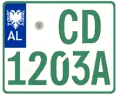 A new format similar to the post-1994 Italian and post-2009 French plate designs has been introduced since 16 February 2011.[1] The plates start with a blue strip at the left with 'AL' and redesigned double-headed eagle in white, 2 serial letters, security hologram, 3 digits, 2 serial letters on a rectangular white background, and end on the right with a blue strip that's supposed to show year of registration and regional code in white on. It has been observed that the last two identification elements are de facto not included while the font is more emphasized than the post-2002 one.[2] Plates of all vehicles would experience a similar change.[3] Critics claim that the color of the double headed eagle and strip is not representative of red and black colors of the Albanian flag.