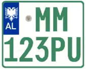 Agricultural vehicle registration plates in Albania have white borders and white texts on a green background. They follow the format [AA MB 00], where MB stands for Makinave Bujqesore which means Agricultural Vehicle.