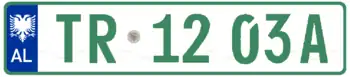 Diplomatic service vehicle registration plates in Albania have green borders and green texts on a white background. They do not have the blue strip on the right hand-side of the plate, unlike private vehicle registration plates. They follow the format [TD 00 00A], where TD stands for Truput Diplomatic, which means "Diplomatic Corps" in Albanian. The first 2 digits of the license plate refer to the Diplomatic license plate codes.