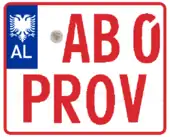 Test Vehicle registration plates in Albania have red borders and red texts on a white background. They follow the format [AA 0 PROV], where PROV stands for Provë which means Test.