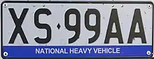 FB-12AA in Black on white reflection base, and blue band legend with the words NATIONAL HEAVY VEHICLE imprinted on it.