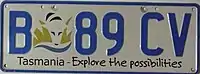 | Tasmania | Blue/white | Y nn aa | Tasmania – Explore the possibilities | Y 00 SN | State logo (a thylacine in reeds) screened at left. Legend screened at bottom. Serials Z 00 AA through Z 99 ZZ issued first, followed by Y 00 AA onwards. Suffix letters IA-IZ and OA-OZ not used. |