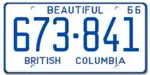 1966 | Embossed blue serial on white plate with border line; "BRITISH COLUMBIA" centred at bottom; "66" at top right | "BEAUTIFUL" centred at top | 123-456 | 1 to approximately 674-000 | |
