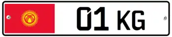 The license plates have the format ## - ### xxx, where the first two digits are province codes. The plate is black on white. Right under the province codes, there is the Kyrgyz flag and the code KG.