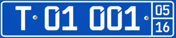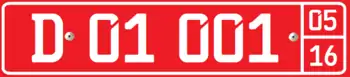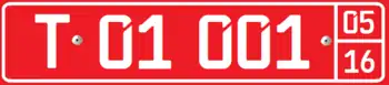 Diplomatic license plates are white on red, whereas the license plates for UN vehicles are white on blue. The license plates have the format L ## ###. The letter could be any of the following: