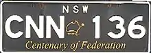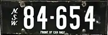 The Australian state of New South Wales requires its residents to register their motor vehicles and display vehicle registration plates.[1] Current regular issue plates are to the standard Australian dimensions of 372 mm (14.6 in) in length by 134 mm (5.3 in) in height, and use standard Australian serial dies.[2]