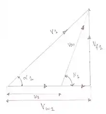 An example of a velocity triangle drawn for the inlet of a turbomachine. The "1" subscript denotes the high pressure side (inlet in case of turbines and outlet in case of pumps/compressors).