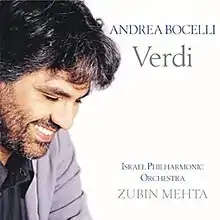 Verdi is Andrea Bocelli's seventh studio album and fourth classical album, of Verdi's most famous arias, released in 2000. The Israel Philharmonic Orchestra, conducted by Zubin Mehta, accompanied Bocelli for the album.[1] The album was certified Gold in the US by the Recording Industry Association of America[2] and in Switzerland by IFPI of Switzerland,[3] Platinum in Canada by the Canadian Recording Industry Association,[4] and Double Platinum in the Netherlands by the Nederlandse Vereniging van Producenten en Importeurs van beeld- en geluidsdragers.[5]