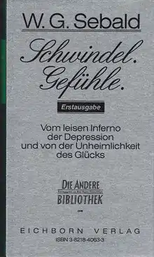 Vertigo (German: Schwindel. Gefühle.) is a 1990 novel and the first by the German author W. G. Sebald. The first of its four sections, titled 'Beyle, or Love is a Madness Most Discreet', is a short but conventional biography of Stendhal, who is referred to not by his pen name but by his birth name of Beyle. The second, 'All'estero', is a travelogue of two journeys made to the Alpine region by an unnamed narrator whose biography resembles Sebald's; an episode from the life of Casanova is also featured. The third, 'Dr K Takes the Waters at Riva', describes a difficult period in the life of Franz Kafka, referred to only as "Dr. K." Kafka's short story The Hunter Gracchus is re-told in summary form and the meaning of the hunter's ceaseless voyage interpreted by the narrator as Kafka's penitence for a longing for love. And the fourth, 'Il ritorno in patria', is a nostalgic recounting of the narrator's visit to his German hometown of "W," a rural village which he has seen nothing of for decades.[1][2] The narrator recalls one of the town's residents, Hans Schlag the huntsman, who, falling to his death, suffers the same fate as the huntsman in Kafka's short story. Sebald makes notable use of leitmotif, such as sensations of dizziness as suggested in the title, and deceased persons lying covered on platforms. The novel functions along with Sebald's subsequent works The Emigrants and The Rings of Saturn as a trilogy.[3] All three works were translated into English by Michael Hulse in partnership with Sebald.