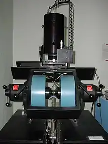 A vibrating-sample magnetometer (VSM) (also referred to as a Foner magnetometer) is a scientific instrument that measures magnetic properties based on Faraday’s Law of Induction. Simon Foner at MIT Lincoln Laboratory invented VSM in 1955 and reported it in 1959.[1] Also it was mentioned by G.W. Van Oosterhout[2] and by P.J Flanders in 1956.[3] A sample is first placed in a constant magnetic field and if the sample is magnetic it will align its magnetization with the external field. The magnetic dipole moment of the sample creates a magnetic field that changes as a function of time as the sample is moved up and down. This is typically done through the use of a piezoelectric material. The alternating magnetic field induces an electric field in the pickup coils of the VSM.[4] The current is proportional to the magnetization of the sample - the greater the induced current, the greater the magnetization. As a result, typically a hysteresis curve will be recorded[5] and from there we can deduce the magnetic properties of the sample being measured.