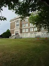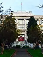 The high school opened on August 7, 1876, in a log cabin with two classrooms on the school reserve between Yates Street and Fort Street bounded by Fernwood Road, the grounds of the current Central Middle School building.[2] This same cabin had been the first common (or public) school in British Columbia when it was used as a primary school starting in 1853. In 1882, the high school moved to a new wing of a brick building that had been built in 1875–1876 and had been used exclusively as the primary school until occupied by the high school. By 1882 the high school included 80 students and was situated between the primary girls' school in the east wing and the primary boys' school in the west wing.[3] The high school remained pressed between the boys' and girls' central schools until 1903. Victoria's growing population in the 1890s led to Victoria High School being described as "one of the most inadequate school buildings in the Province" by the principal Edward Paul.[4] In 1902 a third Victoria High School was opened which was also quickly outstripped by Victoria's burgeoning population.[5] This facility was designed by Francis Mawson Rattenbury, architect of the British Columbia Parliament Buildings and The Empress Hotel (or Fairmont Empress Hotel).[6]