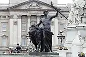At the top of the central pylon stands a gilded bronze Winged Victory, standing on a globe and with a victor's palm in one hand. Beneath her are personifications of Constancy, holding a compass with its needle pointing true north, and Courage, holding a club. Beneath these, on the eastern and western sides, are two eagles with wings outspread, representing Empire. Below these, statues of an enthroned Queen Victoria (facing The Mall) and of Motherhood (facing Buckingham Palace), with Justice (facing north-west towards Green Park) and Truth (facing south-east).[36] These were created from solid blocks of marble, with Truth being sculpted from a block weighing 40 tonnes.[24]