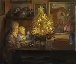 From 1885, he exhibited in Paris; there he was inspired by Claude Monet, particularly in his use of colour as can be seen in his painting Christian Bindslev er syg (Christian Bindslev is ill, 1890), which also shows the influence of Christian Krohg, one of the other Skagen painters. After his return from Paris, his paintings took on lighter tones; he had noted the absence of black in the works of the French artists and considered his own earlier works too dark by comparison.[2] Nevertheless, Johansen is remembered particularly for the subdued lighting effects of his interiors — many of which were painted after his visit to Paris — as in his Glade jul (Merry Christmas, 1891),[note 1] Aftenpassiar (Evening Talk, 1886) and Aftenselskab i kunstnerens hjem (Evening Gathering at the Artist's Home, 1899) and his scenes of domestic family life, but he also painted landscapes (at Skagen, at Tisvilde, and at his childhood home, the fishing port of Dragør outside Copenhagen), still lifes and portraits.[4] After a falling out with P.S. Krøyer in 1891, Johansen's relationship with the Anchers was strained and he and his family did not visit Skagen for several years.[5]