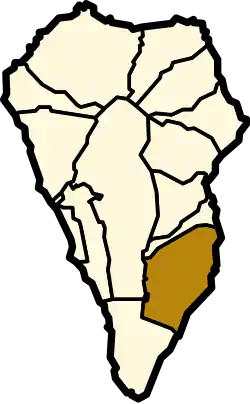 Villa de Mazo is a town and a municipality on the island of La Palma, Province of Santa Cruz de Tenerife, Canary Islands, Spain. It is situated in the southeastern part of the island. The population of the municipality is 4,858 (2013)[3] and the area is 71.17 km².[1] Villa de Mazo is 9 km south of the island capital Santa Cruz de La Palma. La Palma Airport is located on the coast of Villa de Mazo.