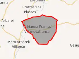 Villanovafranca borders the following municipalities: Barumini, Escolca, Gesico, Guasila, Las Plassas, Villamar.