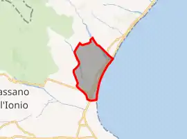 Located in the northern corner of its province, close to the borders of Calabria with Basilicata, Villapiana borders with the municipalities of Cassano all'Ionio, Cerchiara di Calabria, Francavilla Marittima, Plataci and Trebisacce.[3] The municipality includes the hamlets (frazioni) of Villapiana Lido[4] and Villapiana Scalo,[5] both by the Ionian Coast.