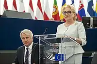 Vasilica Viorica Dăncilă (Romanian pronunciation: [vasiˈlika vi.oˈrika dənˈtʃilə]; born 16 December 1963)[1] is a Romanian politician, former leader of the Social Democratic Party (PSD), and was Prime Minister of Romania from 29 January 2018 to 4 November 2019.[2] She is the first woman in Romanian history to hold both the office of Prime Minister and that of president of the PSD. In 2014, she was elected to a second term as a Member of the European Parliament (MEP), representing the PSD. She was also president of the Social Democratic Women's Organization (OFSD) between 2015 and 2018.