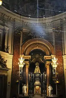 The basilica which now houses the image of 'Our Lady' was built on the site of a Roman temple. A renaissance arch leads from the Basilica on Plaza de la Virgen to Valencia cathedral. Inside the Basilica there is a Gothic style statue of The Virgin with two children at her feet. A mechanical device allows the statue to revolve. Antonio Palomino (1653 - 1726) painted the frescoes on the dome of the nave.[6]