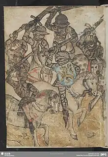The poem also shows Dietrich's continued resistance to courtly love service and chivalry in the service of ladies, topics also found in the Goldemar fragment and the Eckenlied.[20] While the Vienna and Dresden versions end with Dietrich marrying Virginal, in the Heidelberg version he successfully resists the narrative expectation that he ought to marry Virginal after rescuing her. The poem emphasizes the fellowship of the heroic warriors, particularly between Dietrich and Hildebrand, as the heroes join forces to defeat adversaries such as Orkise or the giants at Muter. The defeat of giants and heathens, moreover, appears to be a duty for Dietrich as a ruler.[18]