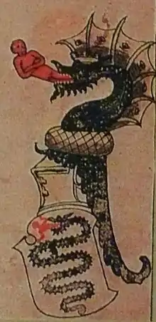 The tale connecting Dietrich to the rescue a man half-swallowed by a serpant or dragon appears to be part of a wide-spread oral tradition about Dietrich. This image first occurs on an exterior frieze at the Alsatian abbey of Andlau (c. 1130/40?) and on the capital of a column in the cathedral of Basel (after 1185): this could be a depiction of this story about Dietrich, but might also be a general depiction of good vanquishing evil.[27] Lienert dismisses these sculptural depictions as unrelated to Dietrich.[19] Another version of the same story is also found in the Thidrekssaga: there Dietrich and Fasolt come across the knight Sintram, Hilderband's nephew, in the mouth of a dragon. Fasolt rescues the Sintram with the use of a sword stuck in the dragon's mouth.[24] Sintram also appears as the name of the man being swallowed by the dragon also in a 15th-century Swiss chronicle, by the Bernese Chronicle of Konrad Justinger, which relocates the action to Bern, Switzerland, and does not include Dietrich's name. It is thus not clear if the motif was transferred onto Dietrich from an independent legend or whether the Swiss version had lost the original connection with Dietrich.[24] In the Virginal, the presence of this story may be connected to the coat of arms of the Visconti, which depicts a man being swallowed by a dragon. The Visconti were in possession of the case of Arona (Arone) at the time of the Virginal's composition, and this is the castle where Rentwin and his father Helferich live.[28] However, this coat of arms is only attested for the Visconti beginning in the fourteenth century.[29] Heinzle dismisses attempts to connect the image to similar stories about Sinbad the Sailor.[29]