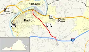 State Route 177 (SR 177) is a primary state highway in the U.S. state of Virginia. The state highway runs 4.41 miles (7.10 km) from Interstate 81 (I-81) near Radford north to U.S. Route 11 (US 11) in Radford. SR 177 directly connects I-81 with the eastern part of the independent city of Radford, including Radford University.