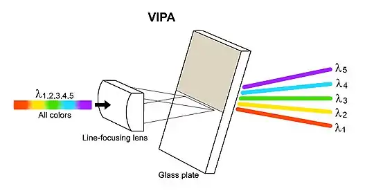A drawback of the VIPA is its limited free spectral range due to the high diffraction order. To expand the functional wavelength range, a VIPA can be combined with a regular diffraction grating to provide a broadband two-dimensional spectral disperser.[12] This was demonstrated for high-resolution WDM (> 1000 channels),[13] and has also been applied to various fields and devices, such as a laser frequency comb,[14] a spectrometer,[15] an astrophysical instrument,[16] Brillouin spectroscopy in biomechanics,[17][18] beam scanning,[19] microscopy,[20] tomography imaging,[21] and metrology.[22]