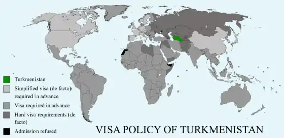 In accordance with the law, citizens of all countries require a visa to visit Turkmenistan, unless they have special passports or are from certain parts of Kazakhstan or Uzbekistan.[1] To obtain a tourist visa for Turkmenistan, all foreign nationals must supply an invitation letter issued by a travel agency licensed in Turkmenistan.[2]