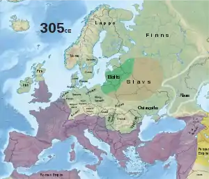 The Visigoths emerged from the Gothic tribes, most likely a derivative name for the Gutones, a people believed to have their origins in Scandinavia and who migrated southeastwards into eastern Europe.[25] Such understanding of their origins is largely the result of Gothic traditions and their true genesis as a people is as obscure as that of the Franks and Alamanni.[26] The Visigoths spoke an eastern Germanic language that was distinct by the 4th century. Eventually the Gothic language died as a result of contact with other European people during the Middle Ages.[27]