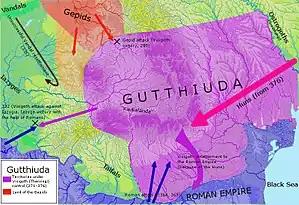 Wolfram believes that "Vesi" and "Ostrogothi" were terms each tribe used to boastfully describe itself and argues that "Tervingi" and "Greuthungi" were geographical identifiers each tribe used to describe the other.[8] This would explain why the latter terms dropped out of use shortly after 400, when the Goths were displaced by the Hunnic invasions.[16] Wolfram believes that the people Zosimus describes were those Tervingi who had remained behind after the Hunnic conquest.[17] For the most part, all of the terms discriminating between different Gothic tribes gradually disappeared after they moved into the Roman Empire.[8]