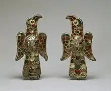 ![]() The eagles represented on these fibulae from the 6th century, and found in Tierra de Barros (Badajoz), were a popular symbol among the Goths in Spain.[lower-alpha 1] | |