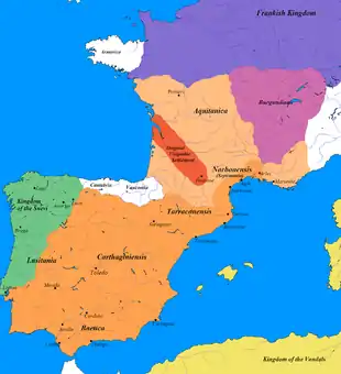 At this point, the Visigoths were also the dominant power in the Iberian Peninsula, quickly crushing the Alans and forcing the Vandals into north Africa.[64] By 500, the Visigothic Kingdom, centred at Toulouse, controlled Aquitania and Gallia Narbonensis and most of Hispania with the exception of the Kingdom of the Suebi in the northwest and small areas controlled by the Basques and Cantabrians.[65] Any survey of western Europe taken during this moment would have led one to conclude that the very future of Europe itself "depended on the Visigoths".[66] However, in 507, the Franks under Clovis I defeated the Visigoths in the Battle of Vouillé and wrested control of Aquitaine.[67] King Alaric II was killed in battle.[62] French national myths romanticize this moment as the time when a previously divided Gaul morphed into the united kingdom of Francia under Clovis.[68]