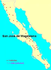 Location of Visita de San José de Magdalena among the Spanish missions in Baja California