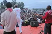 On March 25, 2009, he delivered a speech resigning as President of the National Assembly.[9][10] On December 14, 2010 Kamerhe officially quit the PPRD, announcing his candidacy for the 2011 presidential election and the creation of his new party,[11] the UNC,[12] which had its official inauguration in February 2011. He gained 7.74% of the country's vote in the 2011 presidential election under the UNC name.