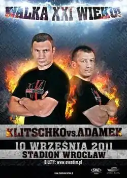 Vitali Klitschko vs. Tomasz Adamek was a Heavyweight Championship fight for the WBC title. The fight took place at the Stadion Miejski in Wrocław, Lower Silesian, Poland on September 10, 2011, and was televised via HBO World Championship Boxing.[1] As a part of a split-site doubleheader, the broadcast also featured the Yuriorkis Gamboa vs. Daniel Ponce de León bout taking place at the Boardwalk Hall in Atlantic City, New Jersey, United States.[2] In Poland, the bout was available on Cyfra+ pay-per-view platform, making it the first PPV fight in Polish television history.[3][4]