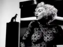 Filmed in black-and-white, the video recalls the look of films and photography from the Golden Age of Hollywood with the use of artwork by the Art Deco artist Tamara de Lempicka and an Art Deco set design. Many of the scenes are recreations of photographs taken by noted photographer Horst P. Horst, including his famous Mainbocher Corset, Lisa with Turban (1940), and Carmen Face Massage (1946). Horst was reportedly "displeased" with Madonna's video because he never gave his permission for his photographs to be used and received no acknowledgement from Madonna.[42] Some of the close-up poses recreate noted portraits of such stars as Marilyn Monroe, Bette Davis, Veronica Lake, Greta Garbo,[43] Marlene Dietrich, Katharine Hepburn, Judy Garland and Jean Harlow. (Additionally, several stars of this era were name-checked in the song's lyrics.)[44] Several famous Hollywood portrait photographers whose style and works are referenced include George Hurrell,[45][46] Eugene Robert Richee,[47] Don English,[48] Whitey Schafer, Ernest Bachrach, Scotty Welbourne, László Willinger, and Clarence Sinclair Bull.[49]
