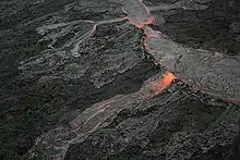More silicic lava flows take the form of block lava, where the flow is covered with angular, vesicle-poor blocks. Rhyolitic flows typically consist largely of obsidian.[46]