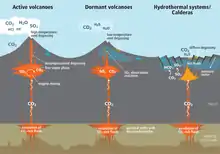 It has long been recognized that eruptions contribute much lower total SO2 emissions than passive degassing does.[5][6] Fischer et al (2019) estimated that, from 2005 to 2015, SO2 emissions during eruptions were 2.6 teragrams (Tg or 1012g) per year[7] and during non-eruptive periods of passive degassing were 23.2 ± 2Tg per year.[7] During the same time interval, CO2 emissions from volcanoes during eruptions were estimated to be 1.8 ± 0.9 Tg per year[7] and during non-eruptive activity were 51.3 ± 5.7 Tg per year.[7] Therefore, CO2 emissions during volcanic eruptions are less than 10% of CO2 emissions released during non-eruptive volcanic activity.