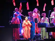 Björk went on an 18-month tour in support of the album, which was her first tour in four years.[92] On the tour, which was conducted on a month-on/month-off basis, Björk performed with fourteen musicians on stage. Björk's touring band for this tour consisted of drummer Chris Corsano, musician Mark Bell (who also accompanied Björk on the Homogenic tour), pianist Jónas Sen (who played celeste on the tracks Gratitude and Cetacea on the Drawing Restraint 9 soundtrack), musician Damian Taylor and a 10-piece female Icelandic brass section.[1][93][94] Björk had described the tour as "kind of primitive, raw, almost butch", in marked contrast to her 2001 tour for Vespertine.[95] At several of the concerts Björk had been joined on stage by some of the musicians who collaborated on the album (but who are not part of the touring band), including ANOHNI, Min Xiao-Fen and Toumani Diabaté. Björk has voiced her dislike of fans recording video or taking pictures with flash at her concerts using their mobile phones, stating that it affects her ability to perform.[95][96] The tour is taking Björk to countries that she has not played in for over a decade, including Mexico, Brazil, Israel, Australia and New Zealand. Live footage of two concerts in Paris and Reykjavík, as well as a session with the tour band at Olympic Studios, were released as part of the Voltaïc box set on 23 June 2009.