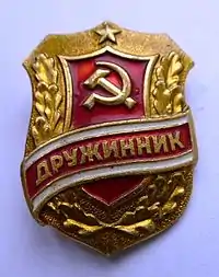 Druzhinas mostly operated in urban neighborhoods. Druzhinniks were distinguished by red armbands with the text "ДНД" or "дружинник" on them.