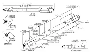 The R-73 is an infrared homing (heat-seeking) missile with a sensitive, cryogenic cooled seeker with a substantial "off-boresight" capability: the seeker can "see" targets up to 40° off the missile's centerline.[5] It can be targeted by a helmet-mounted sight (HMS) allowing pilots to designate targets by looking at them. Minimum engagement range is about 300 meters, with maximum aerodynamic range of nearly 30 km (19 mi) at altitude. The weapon is used by the MiG-29, MiG-31, Su-27/33, Su-34 and Su-35, and can be carried by newer versions of the MiG-21, MiG-23, Sukhoi Su-24, and Su-25 aircraft.[6] India is looking to use the missile on their HAL Tejas. It can also be carried by Russian attack helicopters, including the Mil Mi-24, Mil Mi-28, and Kamov Ka-50/52.