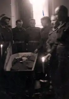 Following the end of World War II, Władysław Grydziuszko was killed in an accident near Treia, Macerata in Italy on January 29, 1946. During a routine 2nd Armoured Brigade (Poland) training period, Władysław was killed when he fell underneath one of his tanks breaking his spine at the neck. The military considered his death "Killed in Action " (KIA) because he was on duty. His death was instantaneous, and soon afterward there was a memorial service held in his honor. Some 400 soldiers attended his funeral. He was buried in the Polish cemetery in Loreto, Italy on January 30, 1946.[4] The two witnesses of his death was a future Polish Politician named Zygmunt Ostrowski pl:Zygmunt Ostrowski and Michał Matusiewicz.