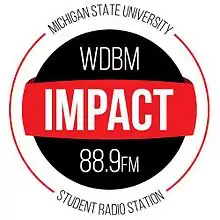 WDBM (88.9 FM), East Lansing, Michigan, United States, branded Impact 88.9, is a 2,000 watt, Class A, student-run college radio station at Michigan State University that broadcasts to listeners in the Lansing metropolitan area. The signal can be heard as far south as Jackson, Michigan, southeast almost to Brighton, and north to Alma, far beyond its 60 dBu service contour which represents its clearest signal.[1] The station is the successor to the Michigan State Network, which in the 1970s was the nation's largest college carrier current radio network, and had studios in several MSU dormitories. The network was eventually consolidated to one carrier current station, WLFT ("Tune to the Left"), which broadcast from the former WKAR studios on the third floor of the MSU Auditorium Building. This was also the first home of WDBM-FM.
