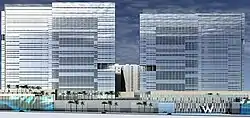 In January 2006, it was announced that the project had received $232.5 million in pre-development financing from Société Générale Corporate and Investment Banking.[3][4] Project details were announced in May 2006. The property would include two 50-story glass towers with a modern design, containing a combined total of 4,000 hotel and condo-hotel units, ranging from 500 sq ft (46 m2) tp 3,000 sq ft (280 m2). Prices would start at $650,000,[5] and the total cost of the project had increased to $2.5 billion.[5][6] It was also announced that Las Vegas' M.J. Dean Construction had been hired as the general contractor, while Las Vegas-based Klai Juba Architects would work with the New York-based Lacina Heitler Architects to design the project along with Charles Allem Designs. Utility installation work had already begun early that month, and M.J. Dean Construction had begun building a $5 million residential sales center.[4]