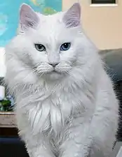 Domesticated cats with blue eyes and white coats are often completely deaf.[54] Deafness is far more common in white cats than in those with other coat colors. According to the ASPCA Complete Guide to Cats, "17 to 20 percent of white cats with non-blue eyes are deaf; 40 percent of "odd-eyed" white cats with one blue eye are deaf; and 65 to 85 percent of blue-eyed white cats are deaf."[55] Although few studies have been done to link this to genes known to be involved in human Waardenburg syndrome, a genetic disruption to neural crest development would lead to this presentation in cats as well.[56] One of the genes that leads to deafness and a white coat in cats when mutated, KIT,[57] has been found to increase MITF expression.[58]