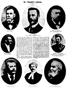 Waddell was elected to the New South Wales Legislative Assembly in 1887 as member for Bourke, serving in the See ministry, prior to assuming leadership of the Progressive Party following the retirement of Sir John See, KCMG due to ill health.[1] The Governor, Sir Harry Rawson, was not prepared to appoint Paddy Crick as Premier, due to his excessive drinking in cabinet meetings, nor Bernhard Wise, who he regarded as unreliable. Waddell was appointed instead and both Crick and Wise declined to serve in his ministry.[1] The three vacancies were filled by the appointment of barrister James Gannon from outside of parliament to be Attorney General and the promotion of ministers without portfolio John Fegan and Walter Bennett.